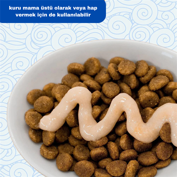 Güzel bir deri ve tüy için omega 3 ve 6 yağ asitleri ile zenginleştirilmiş vahşi deniz ton balığı içeren kediler için tamamlayıcı mamadır.